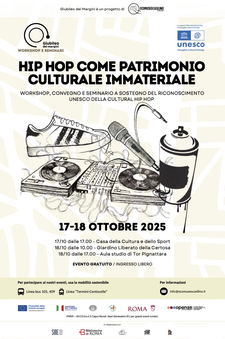 L’iniziativa, promossa da Hip Hop Cinefest, Hip Hop Protection con il supporto dell’Ecomuseo Casilino ad Duas Lauros e di numerosi partner culturali e accademici, si inserisce nel programma degli eventi del “Giubileo dei Margini” e nasce per far conoscere e raccontare l’evoluzione di questa cultura interdisciplinare, che oggi trova spazio nei musei, nelle università e nei progetti educativi, fino a diventare strumento di inclusione e innovazione sociale.