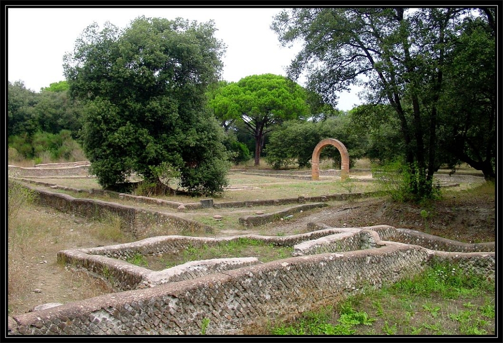 I resti archeologici si riferiscono ad una villa di tipo marittimo con nuclei distinti di notevole estensione e completa di muro di cinta che risulta pressoché continuo tranne che nel lato verso il mare dove presumibilmente doveva essere collocato originariamente l’ingresso principale. Il mare è oggi distante 600 mt. ma allora doveva essere molto più vicino. I resti delle mura sono ancora in buono stato forse perché protetti dalla vegetazione, mentre ben poco rimane del porticato. Al centro dell’impianto si estende un grande peristilio di età giulio-claudia a pianta quadrangolare con lati di circa 40 mt. Il quadriportico si può localizzare facilmente grazie all’arco in laterizio riedificato negli anni Trenta, unico elemento che spicca in elevazione nella parte pianeggiante del complesso. Diversi sono gli ambienti disposti lungo i bracci del quadriportico, tra i quali: uno rettangolare con pavimento a mosaico bianco e nero, forse un triclinio, ed uno absidato.