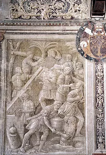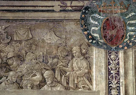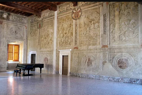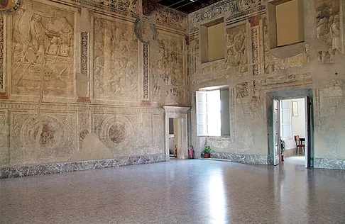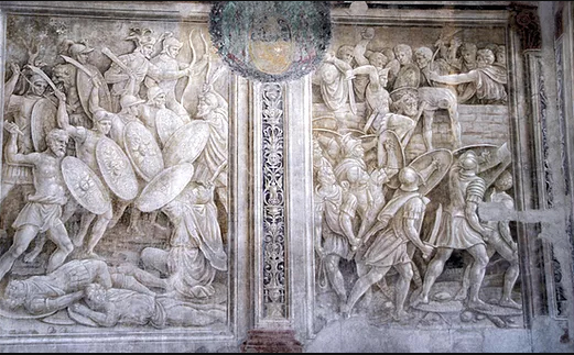 Autore di questi affreschi è Baldassarre Peruzzi e, Giorgio Vasari nel 1568, parlando del pittore nelle sue “Vite”, ne da una minuziosa descrizione, ponendoli però, erroneamente, nel maschio della rocca di Giulio II. Nel XVIII secolo, però dovevano già essere stati coperti e, quando, nel 1776, il Cardinale Giovanni Francesco Albani fece costruire un tramezzo che divideva in due parti il salone, una parete dell’ambiente più piccolo fu decorata con due pannelli dipinti a tempera. Inoltre nella parete di fondo, al centro, c’è l’impronta di un camino monumentale smontato nella seconda metà del secolo scorso. Il progetto, dicevamo, è del Peruzzi, che nel 1512 si trovava a Roma ma alla realizzazione materiale contribuirono vari artisti. Primo fra tutti Cesare da Sesto che si era fermato a Roma nel 1512. Altri quattro pittori presero parte all'esecuzione dell'opera ma con sicurezza si può identificare solo Domenico Beccafumi, che quasi certamente fece un viaggio a Roma tra il 1510 e il 1512. Sua è l'esecuzione dell'ultimo riquadro, il solo che non è tratto dalla colonna Traiana, dove lo stile è notevolmente diverso rispetto al resto delle decorazioni. L’episodio dei “Funerali di Traiano” rappresenta quasi la glorificazione e la conclusione di una storia eroica.