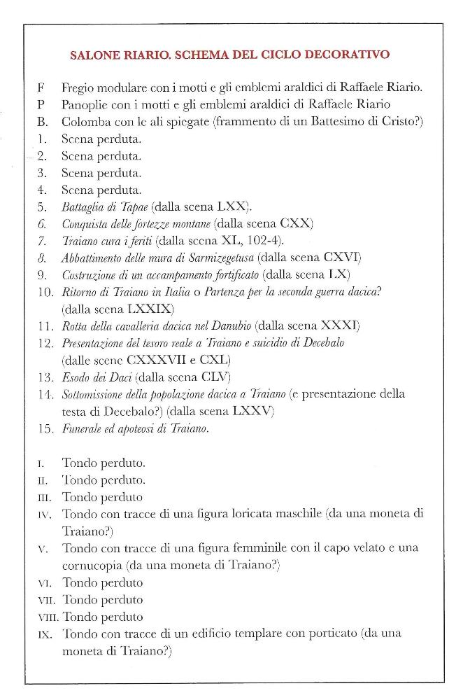 All'interno, nell' ampio e lussuoso appartamento vescovile, ogni stanza fu decorata con affreschi che rappresentavano le imprese di Raffaele Riario, mentre nell’ampio salone al primo piano, le pareti furono decorate con scene di carattere militare (battaglie, assalti, costruzioni di roccaforti, etc.), inquadrate in una finta cornice e leggibili in senso orario cominciando da sinistra. La tecnica è quella dell’affresco monocromo e deriva dal repertorio figurativo della Colonna Traiana, in particolare dagli episodi della guerra di Traiano contro i Daci. L’elenco delle scene e lo schema del ciclo decorativo sono nelle immagini seguenti