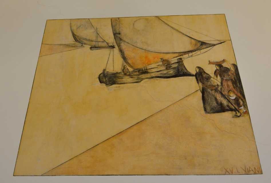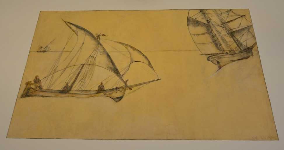 In Velieri nella Tempesta (245x215cm), c’è l’atmosfera instabile delle giornate di libeccio, quando le onde del mare e le nuvole nel cielo sono gonfiate dalle violente raffiche di questo tipico vento umido di sud ovest. Lo spazio è scandito dalla diversa distanza e posizione dei tre velieri ed emergono solo i particolari del sartiame e le figure dei pescatori.