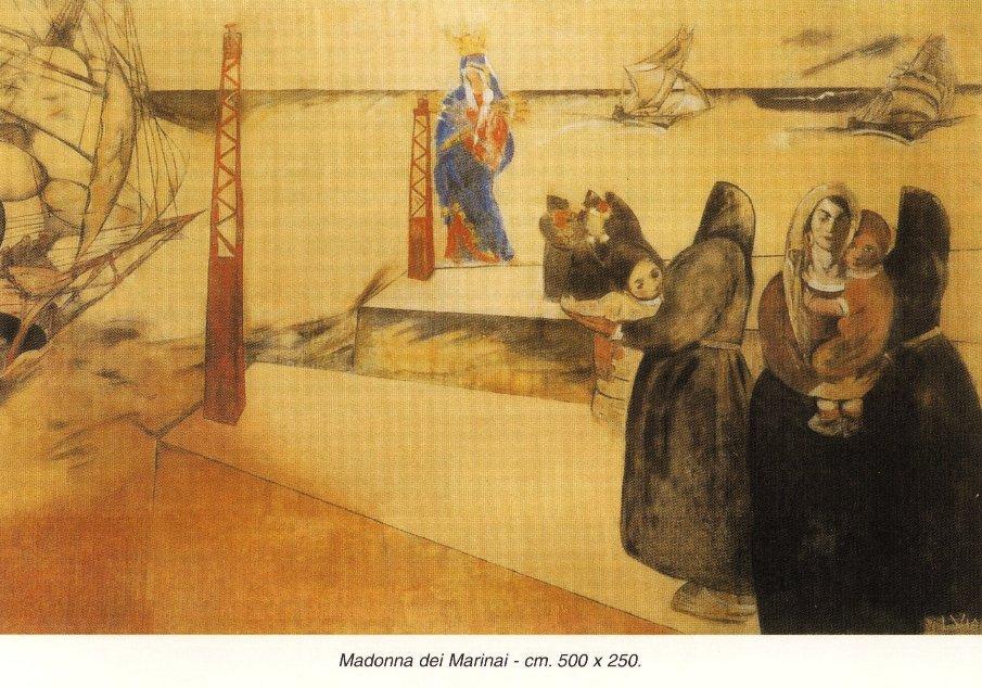 La Madonna dei Marinai (500x250cm), propone il pericoloso rientro di un veliero durante una tempesta, mentre le donne dei marinai con i loro figlioletti si raccomandano alla Vergine Maria, sfolgorante di colori. Sotto un cielo foriero di sciagure lo spazio sembra dilatato in altezza dai caratteristici fanali a traliccio ed in profondità dall’andamento prospettico dei due semplici moli e dalle due paranze, in alto a destra, che lottano contro la furia delle onde per non finire sugli scogli o arenarsi. Nel gruppo delle donne sul molo di destra, particolarmente grave e solenne è l’atteggiamento della madre in primo piano: quasi una figura sacrale, una Maestà del Duecento dalle linee dolci ed austere.