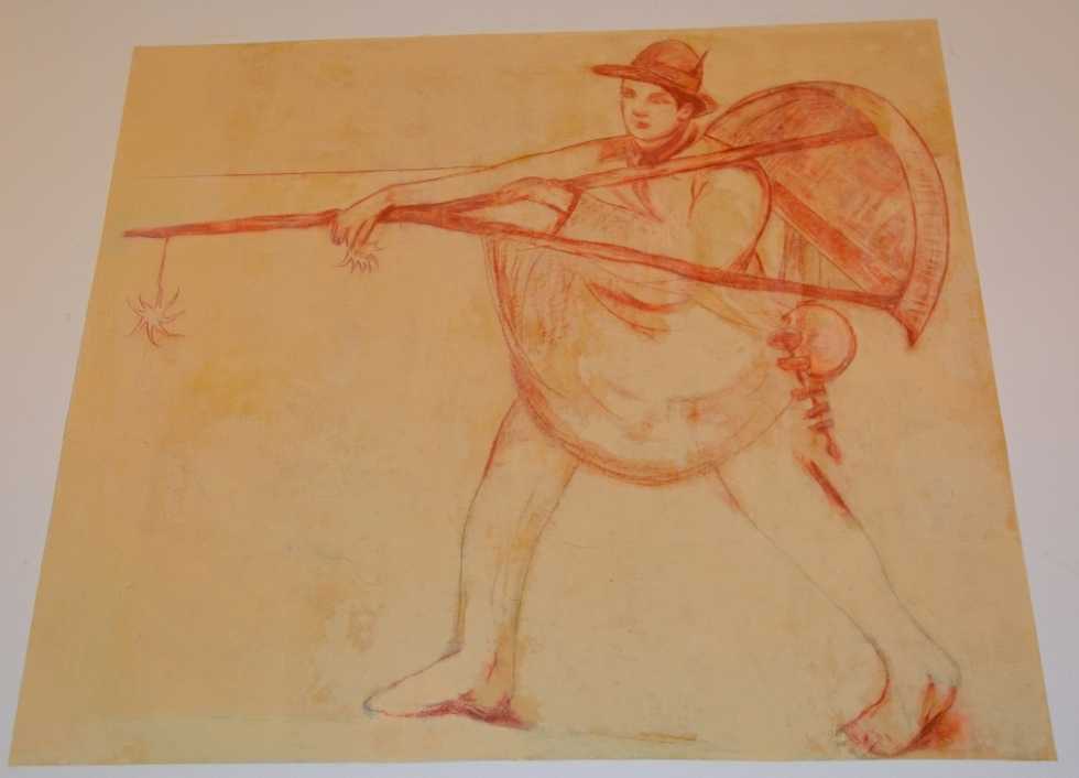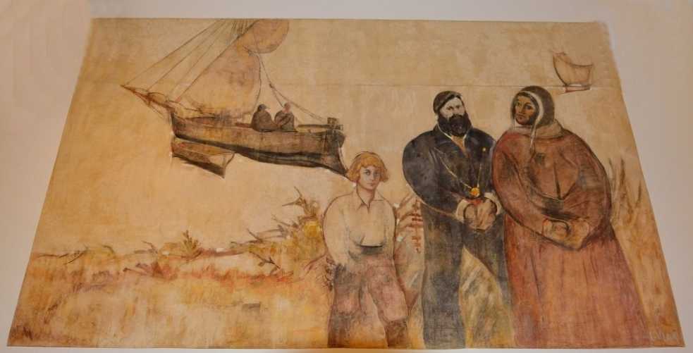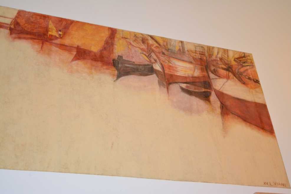 Un’atmosfera di fatalità e rassegnazione impregna ogni elemento dell’opera “L’approdo” (405x250cm), dove, tra le figure in primo piano, il giovane mozzo biondo pare avesse i tratti somatici del suo amato figlio Franchino. “Il Tellinaro” (185x174cm), che incede sulla sabbia con il rastrello e tutti gli altri attrezzi per la pesca, si presenta più come un disegno, con qualche labile campitura color ocra ed un segno che a tratti si intensifica o si affievolisce, ma risulta comunque un’opera armoniosa e vitale.