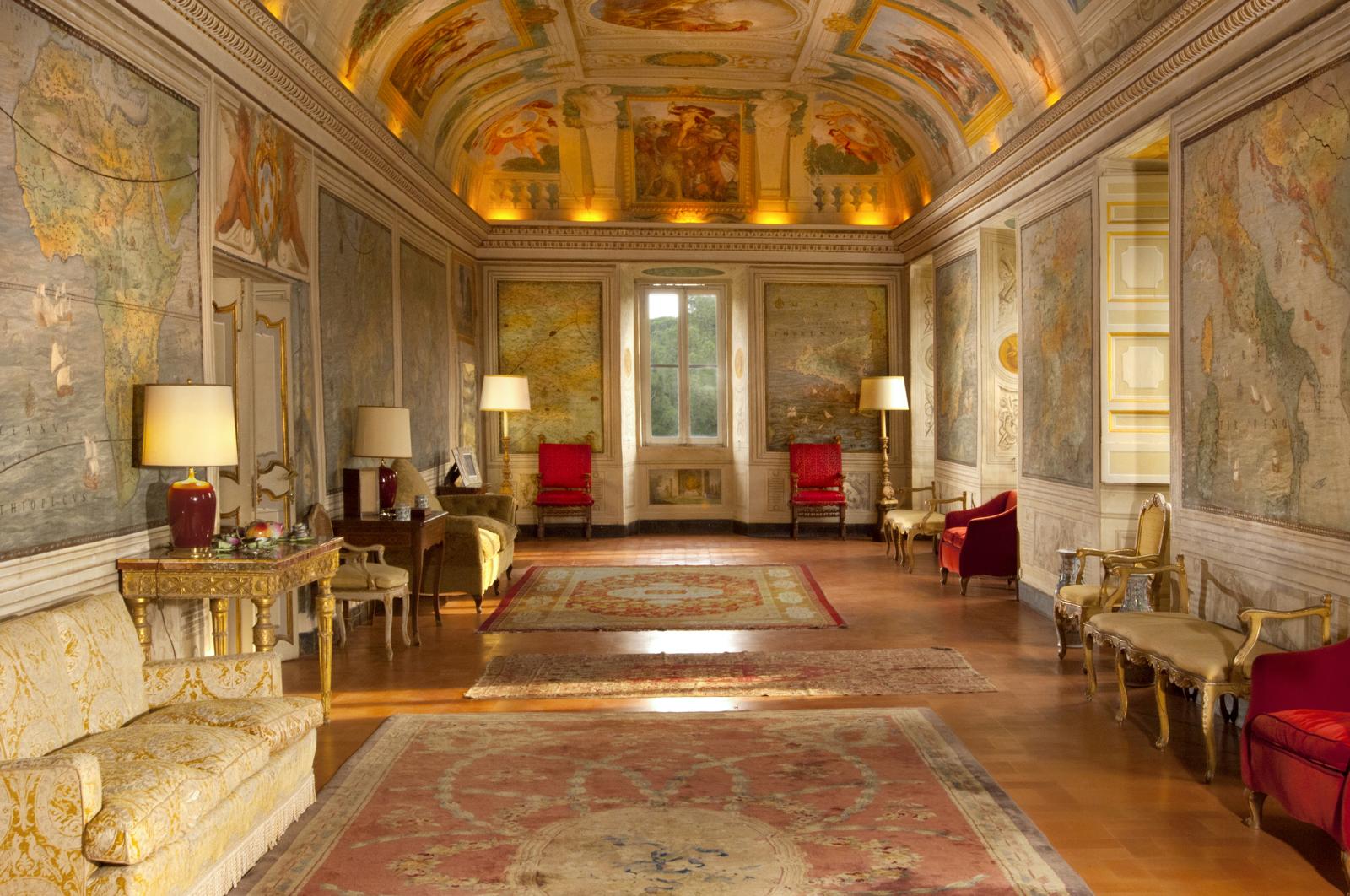 Il soggetto principale degli affreschi, iniziati alla fine del 1627, è il paesaggio naturale circostante. Le pitture del primo piano hanno tutte un motivo religioso, mentre quelle del secondo piano hanno oggetto profano, quasi che il Cardinale Sacchetti volesse distinguere il suo Paradiso e il suo Olimpo terreno. I primi affreschi vennero realizzati nella Galleria delle Carte Geografiche sulle cui pareti sono rappresentati 12 dipinti con i 4 continenti conosciuti, le regioni europee, e alcuni dettagli su Inghilterra, Sicilia, Piana Fiorentina e il Litorale Romano, con la rappresentazione del corso finale del Tevere, il Castello di Giulio II a Ostia antica, il lago di Porto e l’Episcopio. Sulla volta sono rappresentate scene storiche e mitologiche riguardanti la storia di Roma.